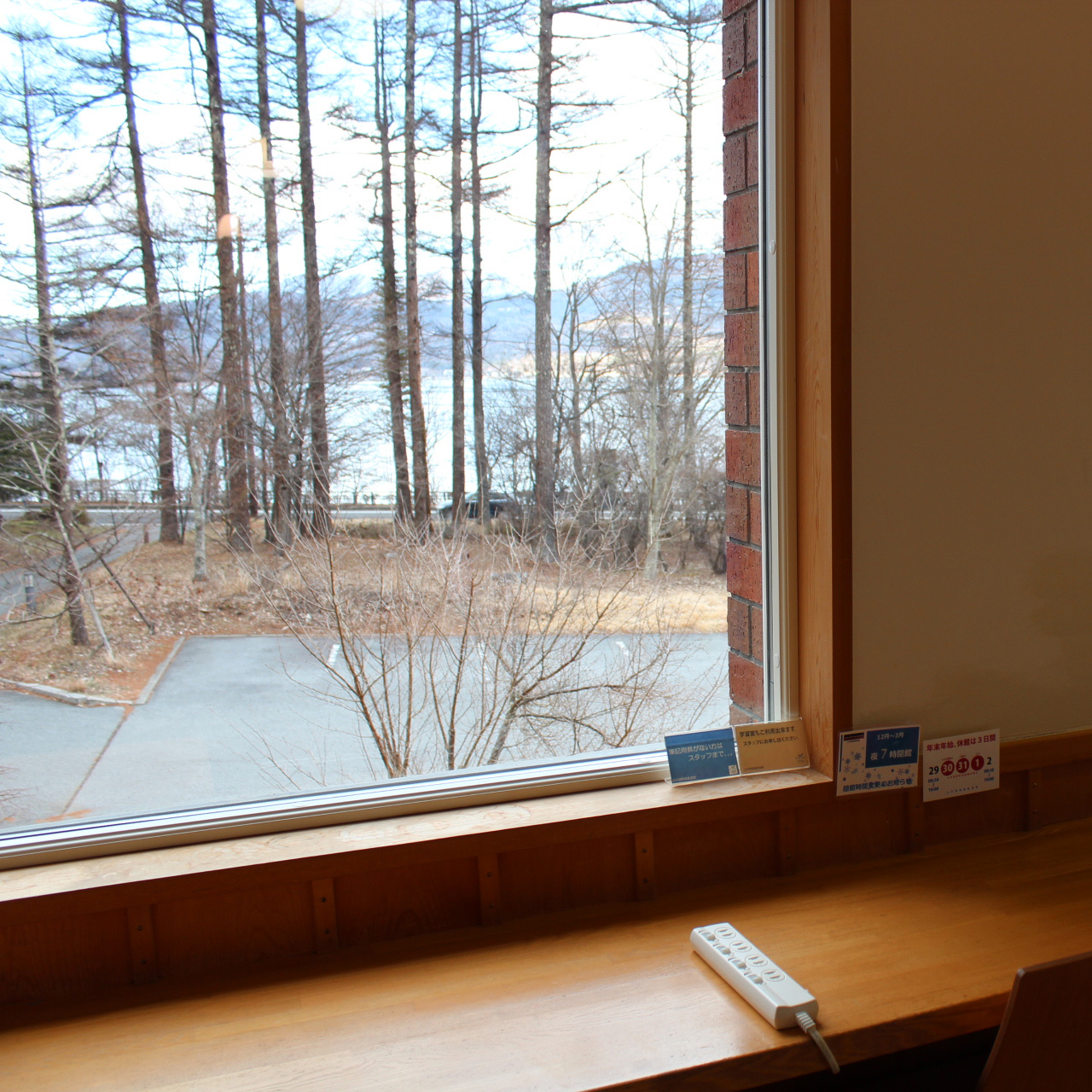 湖を一望できる閲覧席です。電源タップもありますので、ノートパソコンやスマホ、タブレットの充電もできます。